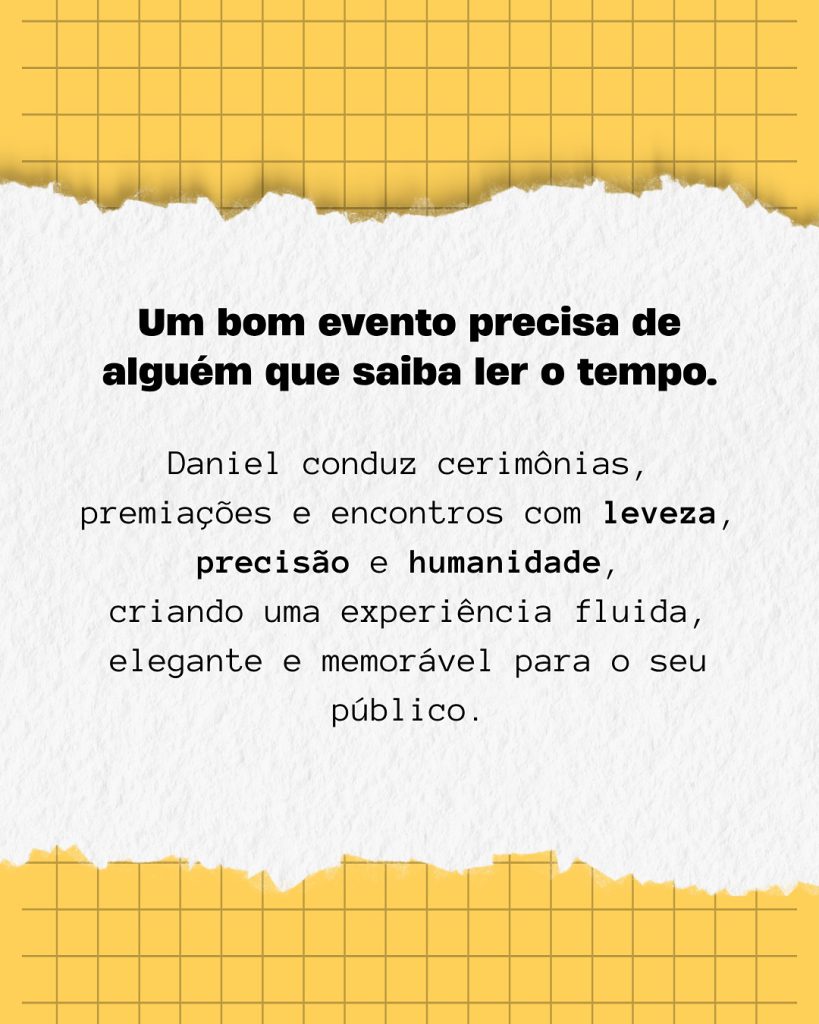 Desde 2003, apresenta e conduz eventos corporativos, premiações e convenções com leveza, ritmo e profissionalismo.