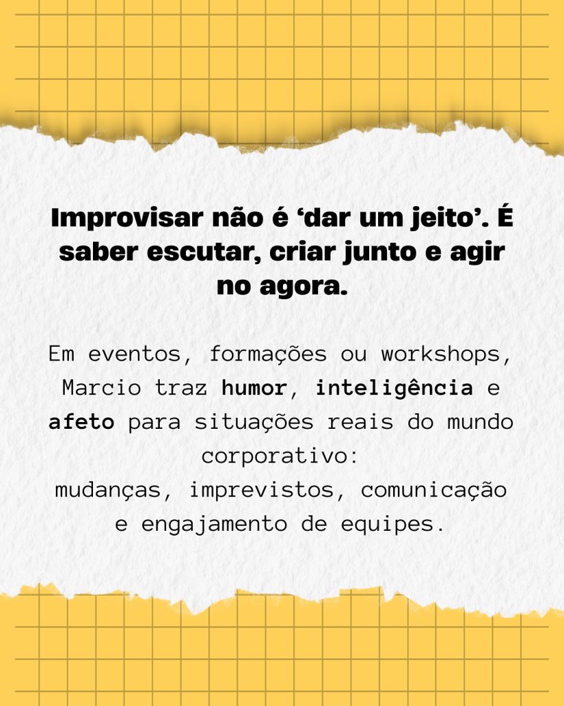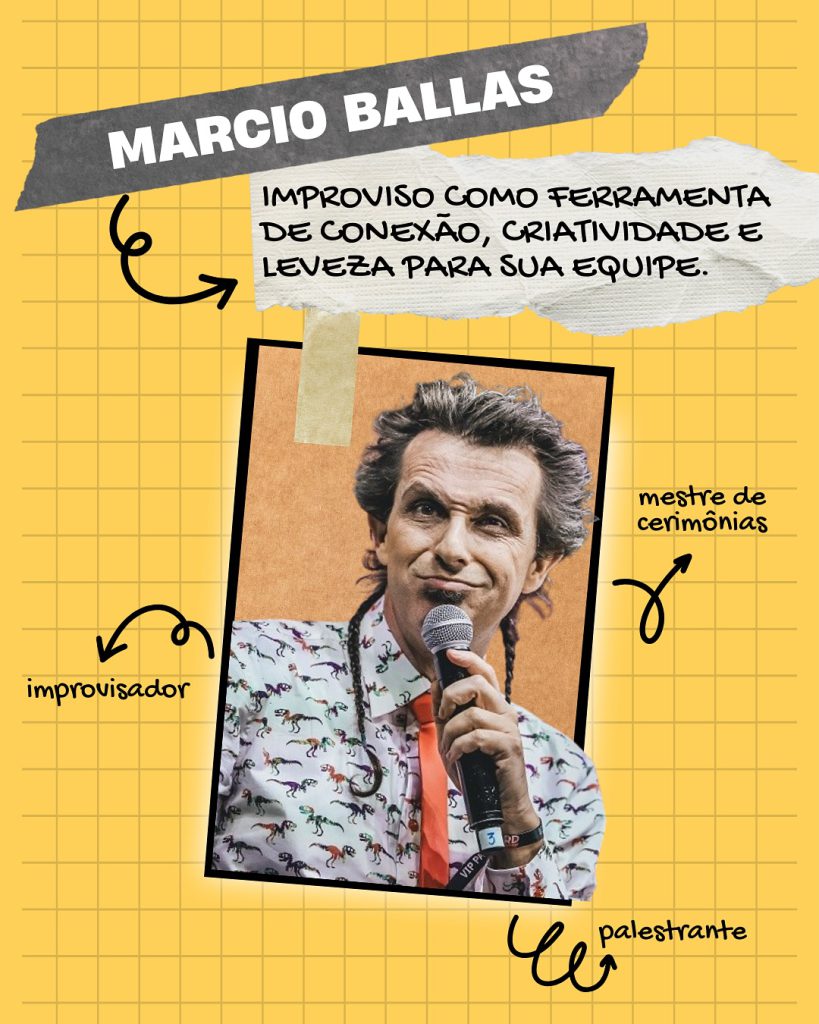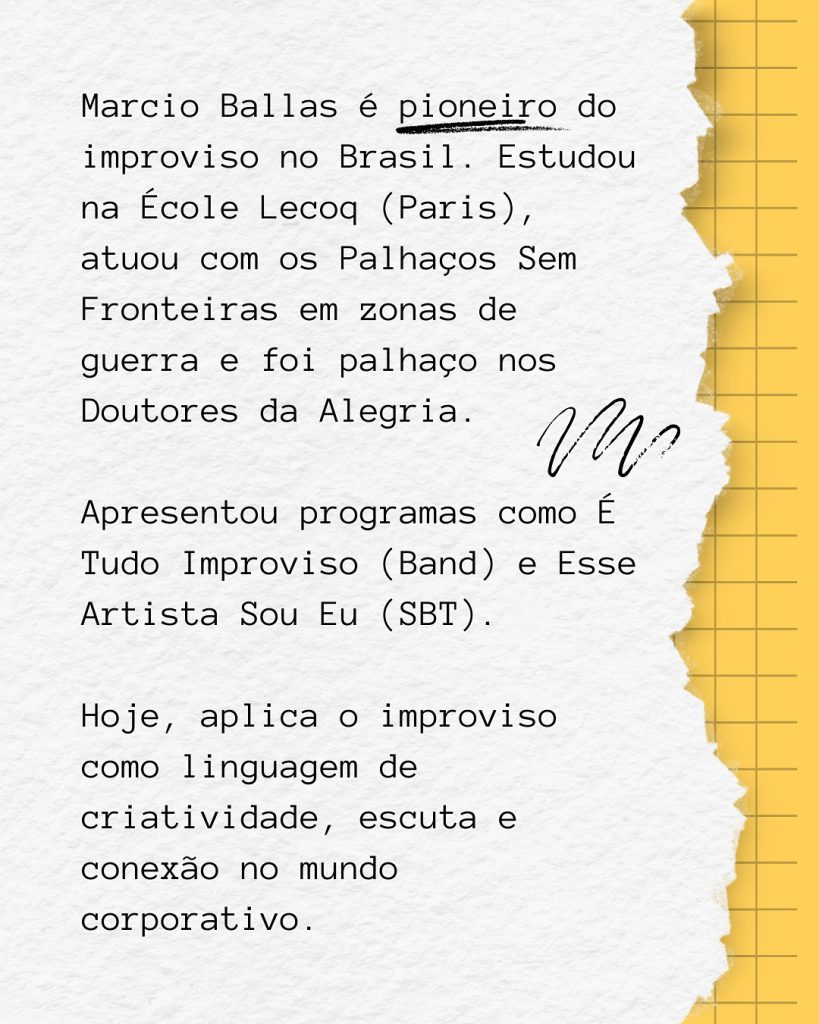 MARCIO BALLAS é improvisador, palhaço e mestre de cerimônias com mais de 20 anos de atuação em palcos, empresas e programas de TV. Estudou em Paris na École Internationale de Théâtre Jacques Lecoq e foi campeão mundial de improviso no Festival Internacional de Bogotá.