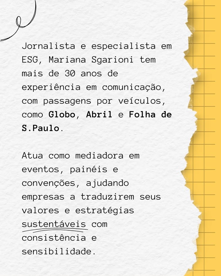 MARIANA SGARIONI é profissional sênior de comunicação, especializada em sustentabilidade empresarial e ESG. Experiência de quase três décadas no cenário editorial e corporativo. Ocupou cargos relevantes nas redações da grande imprensa nacional, como revistas da Abril, Globo, entre outras, onde foi editora, redatora-chefe e repórter. Na Folha de S. Paulo, foi correspondente na Europa, e participou de coberturas internacionais de visibilidade, em parceria com as Nações Unidas e a organização Repórteres Sem Fronteiras.