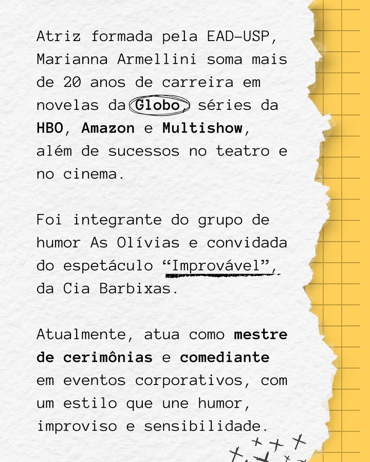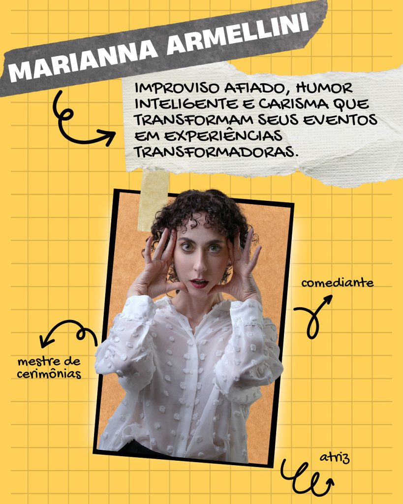 MARIANNA ARMELLINI é atriz, comediante, roteirista e improvisadora com mais de 20 anos de carreira no teatro, cinema, TV e plataformas de streaming.