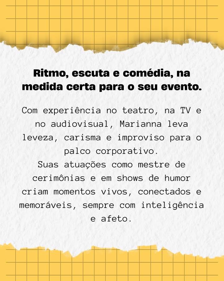 Hoje, atua como mestre de cerimônias e em espetáculos de humor para eventos corporativos, criando experiências leves, vivas e cheias de presença.