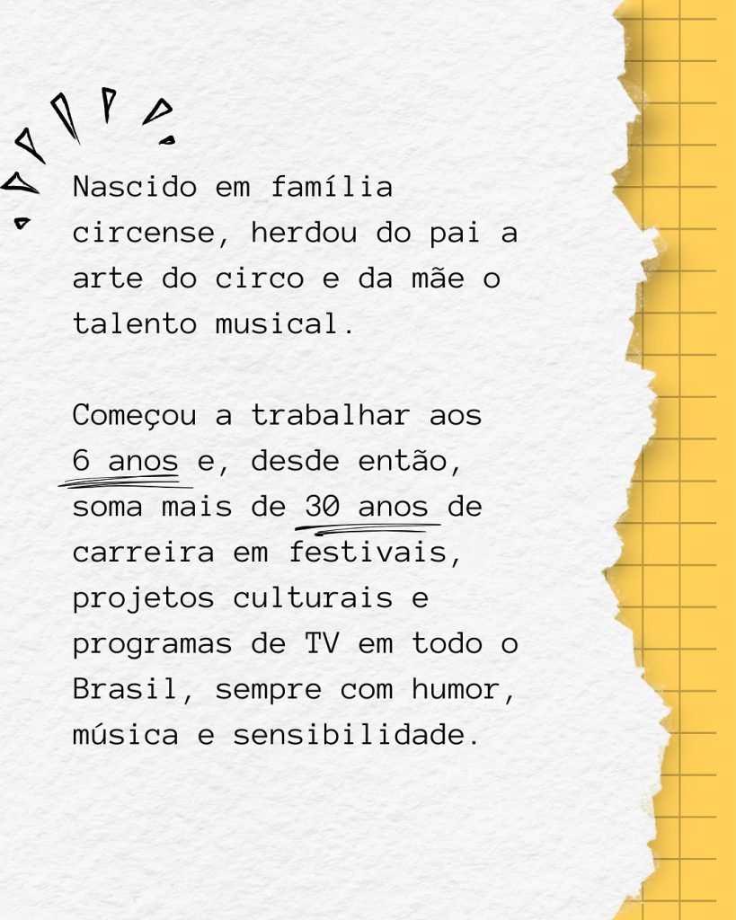 Nascido em uma família de artistas, herdou do pai, o Palhaço Biribinha, a arte circense e da mãe o talento musical. Começou a trabalhar aos 6 anos e desde então já se apresentou em festivais, projetos culturais e programas de TV em todo o Brasil.