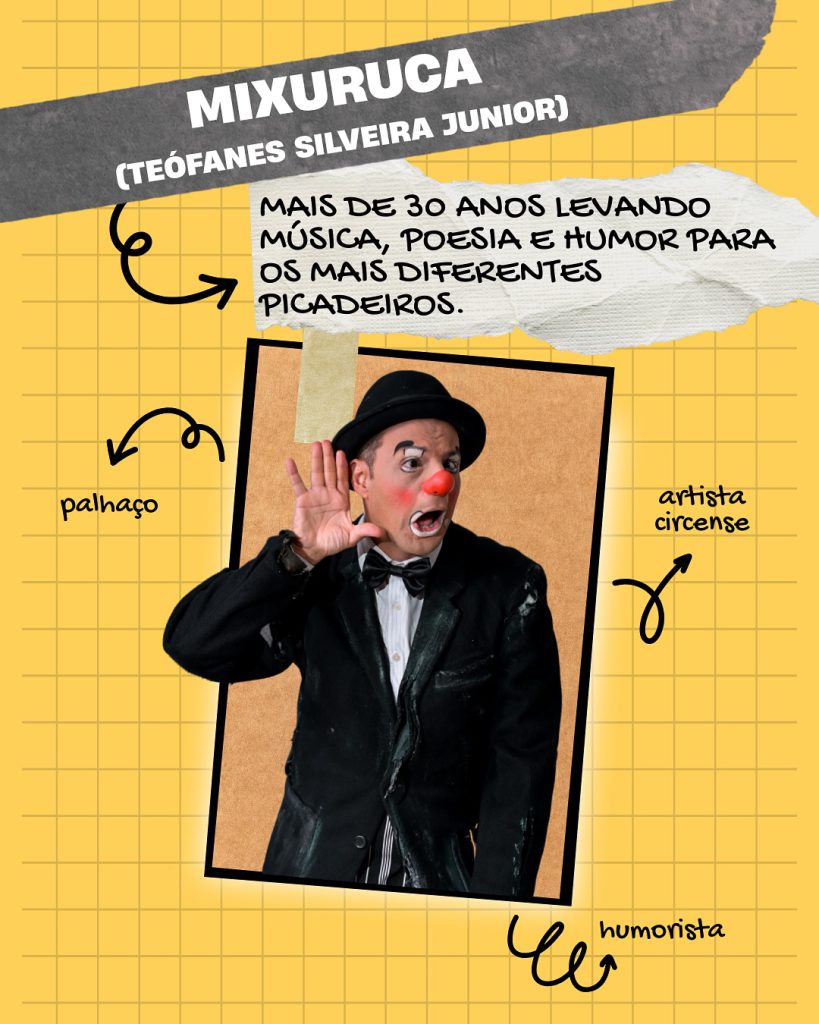 MIXURUCA, nome artístico de Teófanes Silveira Junior, é palhaço, humorista e artista circense com mais de 30 anos de carreira.
