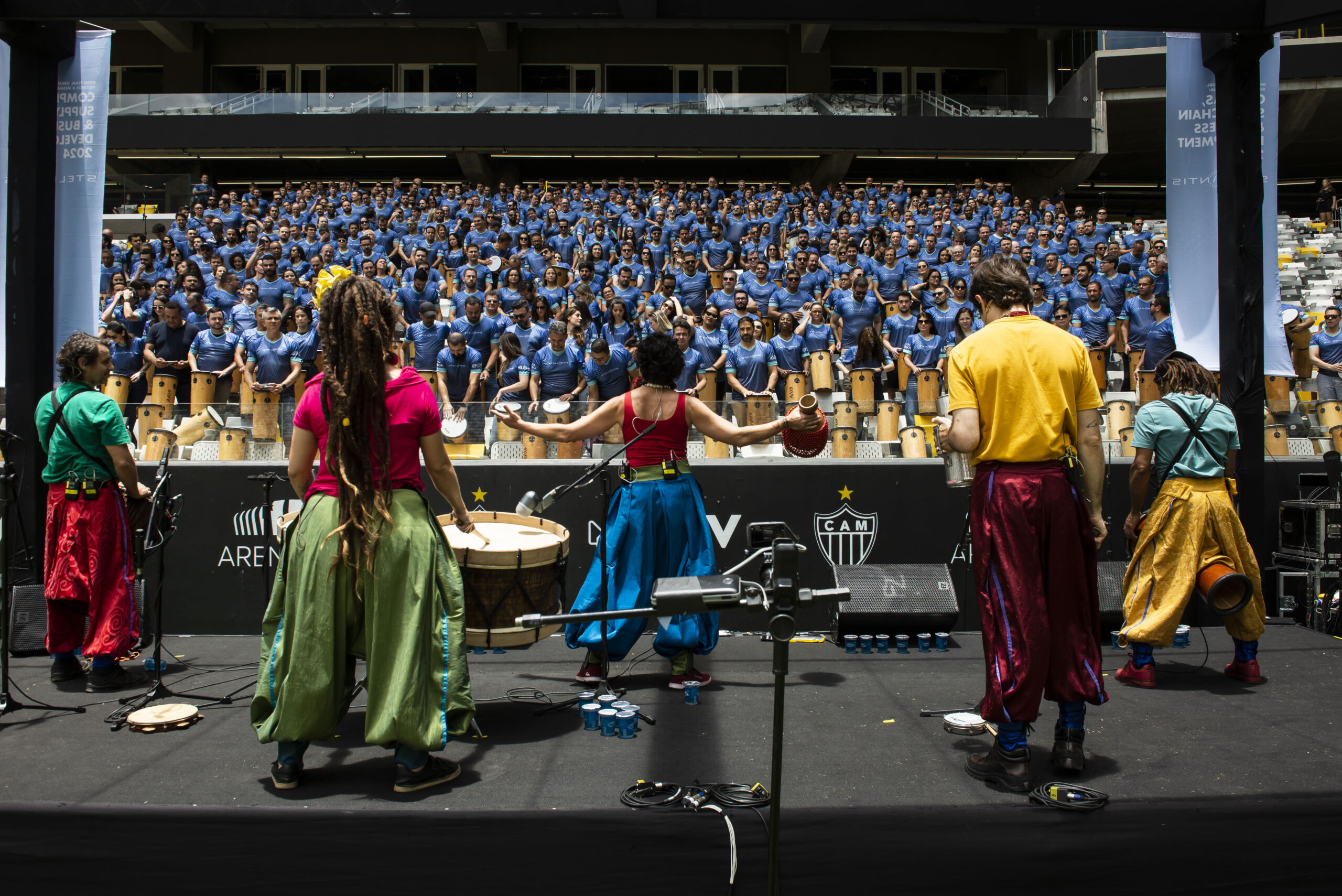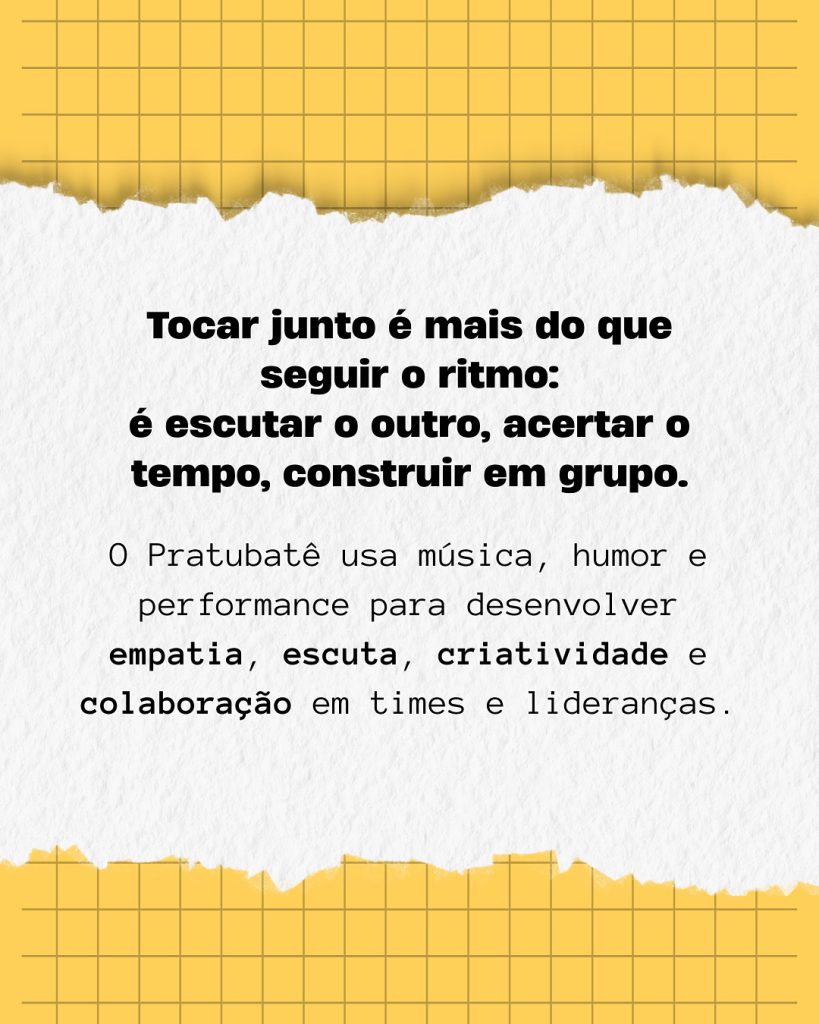 Nessa vivência musical, todos tocam juntos. O grupo convida o público a participar ativamente da performance, criando conexão, presença e melhorando a dinâmica das equipes.