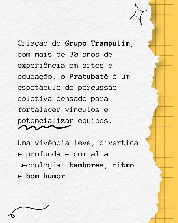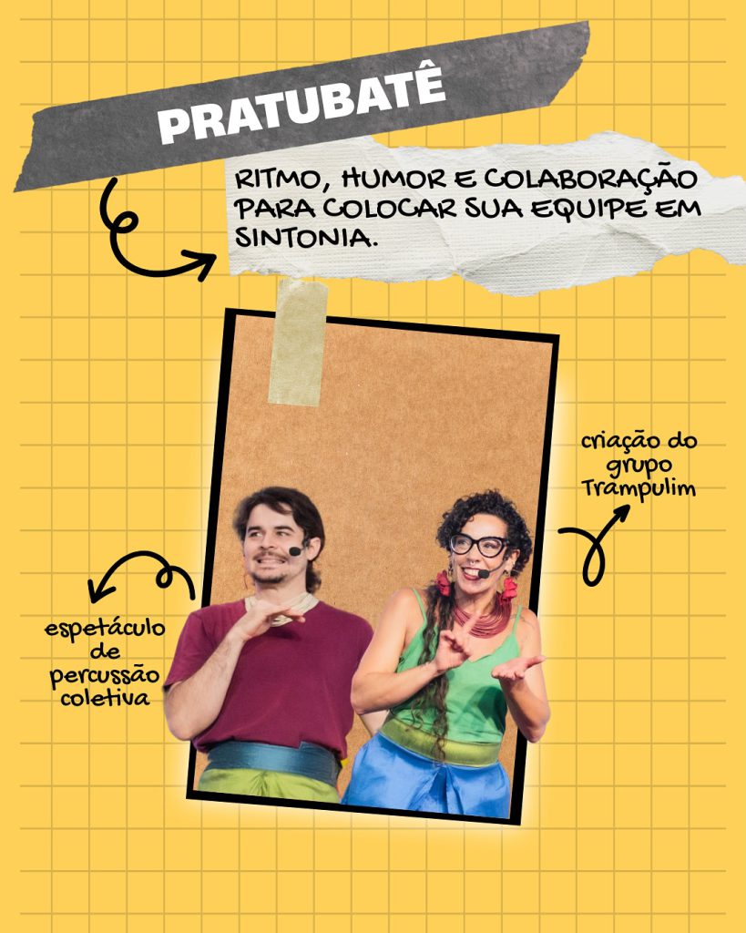 PRATUBATÊ é uma criação do grupo Trampulim, conhecido por unir humor, música e interação em espetáculos vibrantes e envolventes.