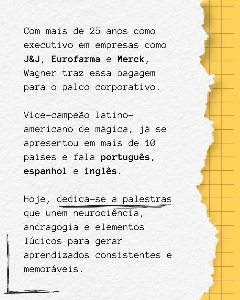 WAGNER MESSA é Palestrante, Executivo, com mais de 25 anos de experiência em grandes empresas como J&J, Eurofarma, MSD, Merck e Takeda, e Mágico profissional